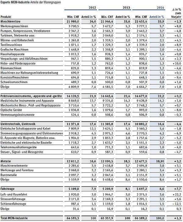 In den verschiedenen Subgruppen der Industriemaschinen wiesen zwei Drittel ein Exportplus auf. Am deutlichsten wuchs der Versand von Hebe- und Fördertechnik. Sie generierte 2014 einen Umsatz von 839 Millionen Franken. Ebenfalls eindrücklich und mit 9 Prozent lediglich einen Prozentpunkt hinter der genannten Subgruppe erhöhten sich die Ausfuhren von Textilmaschinen. Sie generierten einen Umsatz von 1,38 Milliarden Franken. Im Gleichschritt folgten die Werkzeugmaschinen für die Metallbearbeitung mit einem Zuwachs von 8,8 Prozent, mit einem Anteil von 11 Prozent die grösste Subgruppe. Sie generierte 2014 3,779 Milliarden Franken Exportumsatz. China bezog in dieser Subgruppe innerhalb eines Jahres Güter für 29 Prozent (495 Millionen Franken) und wurde somit zum zweitwichtigsten Land nach Deutschland. Unverändert dominieren die Abnehmerländer von Textilmaschinen: Dabei handelt es sich um die Türkei (+28%) mit einem Anteil von einem Viertel, China (-6%) mit 13 Anteilprozenten und Indien (+3%) mit einem Anteil von 7 Prozent. Nennenswert ist der Anstieg der Nachfrage in Usbekistan. Binnen Jahresfrist stieg diese auf das Dreieinhalbfache und machte das Land zum fünftwichtigsten Abnehmer von Textilmaschinen. Preisbedingt nahm die Sparte der nichtelektrischen Kraftmaschinen wie Turbinen, Triebwerke und Kolbenverbrennungsmotoren gegenüber dem Vorjahr lediglich 6 Prozent zu. Im Segment der Turbinen sind nach Deutschland das Vereinigte Königreich und die USA wichtigste Abnehmer, wobei wertmässig fast ein Drittel beziehungsweise die Hälfte mehr exportiert wurde. Im Segment der Wärme- und Kältetechnik sorgten die USA mit Einkäufen von plus 20 Prozent gegenüber dem Vorjahr für einen Gesamtexportumsatz von 1,38 Milliarden Franken (+5%). Im Bereich Verpackungs- und Abfüllmaschinen konnte der Marktanteil 2013 von minus 7 Prozent im Jahr 2014 auf ein Vorjahresplus von 2 Prozent gesteigert werden. Genanntes Segment erzielte 2014 einen Exportumsatz von 900 Millionen Franken.