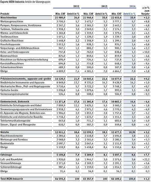 Die Ausfuhren aller grösseren Subgruppen sanken 2014. Am deutlichsten die Exporte in der Sparte Stromerzeugung und Elektromotoren mit einem Minus von 6,8 Prozent auf rund 2,8 Milliarden Franken. Die kleinste Subgruppe, die Telekommunikation, wies ein Absatzminus von 4 Prozent aus und erzielte noch einen Umsatz von 683 Millionen. Im Vergleich zu den Vorjahreszahlen entspricht dies einer Wachstumsrate von weniger als der Hälfte. Die umsatzstärkste