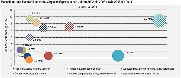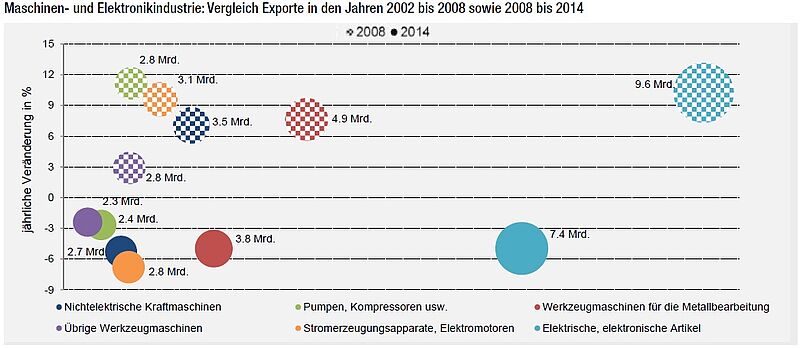 Am Auffälligsten ist, dass sämtliche Sparten vor der Krise ein Exportwachstum erzielten. Nach der Krise zeigen alle Segmente rückläufige Ausfuhren auf. Es zeigt sich zudem, dass gerade jene Sparten, die vor der Krise am stärksten wuchsen, nach der Krise am stärksten Verluste aufwiesen. Die elektrischen und elektronischen Artikeln wuchsen zwischen 2002 und 2008 durchschnittlich 10 Prozent im Jahr, nach der Krise sanken sie jährlich um 5 Prozent. Bei den Werkzeugmaschinen zur Metallbearbeitung betrug der Wachstumsdurchschnitt gute 8 Prozent pro Jahr. Danach erzielte diese Subgruppe jährlich ein Minus von durchschnittlich 5 Prozent. Eine gemächlichere Entwicklung zeigte die Sparte der übrigen Werkzeugmaschinen (+3%) vor 2008 und der Rückgang nach der Krise fiel mit einem Minus von 2 Prozent auch milder aus.