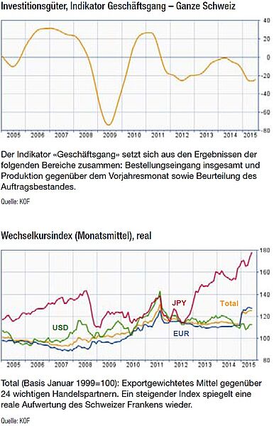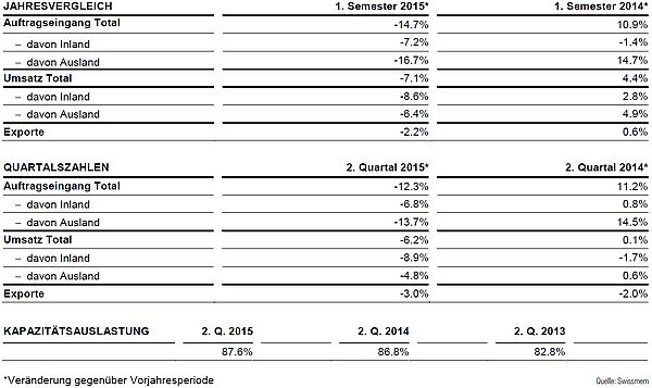 Die Frankenstärke hinterlässt deutliche Spuren. Im ersten Halbjahr 2015 betrugen die Umsatzeinbussen gegenüber der Vorjahresperiode 7,1 Prozent. Die Exporte lagen unter dem Vorjahressemester, vor allem die Exporte in den Euroraum waren rückläufig. Der Rückgang der Auftragseingänge von 14,7 Prozent ist massiv.
