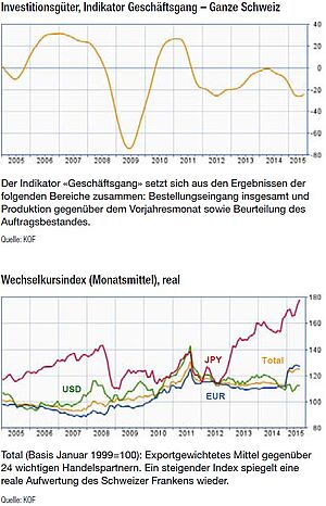 Die Schweizer Wirtschaft erfuhr im ersten Halbjahr 2015 eine Vollbremsung. Die Aufhebung des Euro-Mindestkurses verursachte eine starke Aufwertung des Schweizer Frankens. Die starke Währung machte sich auf breiter Ebene bemerkbar. Insbesondere spürte dies der Industriesektor. Abrupt fiel das Wirtschaftswachstum in den negativen Bereich (- 0,2 %). Das reale BIP wuchs im zweiten Quartal 2015 um schwache 0,2 Prozent. Die Industrie dürfte durch natürliche Hedging (importierte Vorleistungen), längerfristige Lieferverträge und hohe Auftragsbestände etwas abgeschirmt gewesen sein. Dies bedeutet auch, dass die weitere Entwicklung unsicher bleibt. Es darf noch nicht auf eine Trendwende geschlossen werden. Die wichtigen Stimmungsindikatoren, wie der Purchasing Managing Index (PMI), zeigen keine nachhaltige Erholung. Der Index der Konsumentenstimmung sank im Juli 2015 mit 19 Punkten und zeigte eine deutliche Verschlechterung gegenüber April (- 6 Punkte).