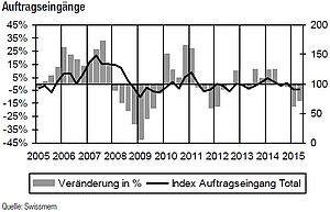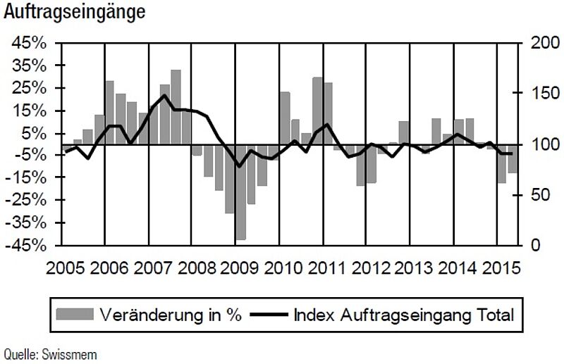 Auch in der besonders unter der Frankenstärke leidenden MEM-Industrie zeigt sich keine Erholung der wirtschaftlichen Entwicklung. Im Vergleich zum ersten Semester 2014 fiel der Auftragseingang im ersten Semester 2015 um 14,7 Prozent – der zweittiefste Indexstand der letzten zehn Jahre.