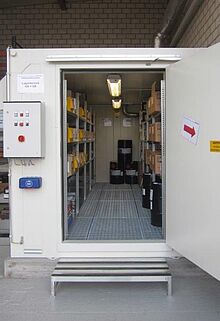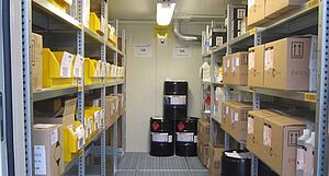 Ein DENIOS Brandschutzlager des Typs BMC wurde geplant, das auf einer Grundfläche von lediglich 10 m2 allen Anforderungen der Stadler AG genügen sollte. Das Lager ist begehbar und bietet rundum Brandschutz nach EI 90 Standard. Der Innenraum des Lagers ist werksseitig als Ex-Zone 1 ausgelegt, um internationalen Explosionsschutzbestimmungen gerecht zu werden. Beleuchtung, technische Belüftung und Brandmelder sorgten für Bedienkomfort und notwendige Sicherheit bei der offenen Lagerung brennbarer Flüssigkeiten. Das System verfügte über eine Auffangwanne aus Stahl, die bis zu 1.350 Liter ausgetretener Flüssigkeit aufnehmen kann. Der verarbeitete Stahl ist chemisch und mechanisch beständig. Der Brandmelder sorgt im Ernstfall für ein automatisches Schliessen der Türen. Für die die Spraydosen, sowie für die Klebe- und Reinigungsmittelreste, wurde ein feuerfester Gefahrstoffschrank installiert.